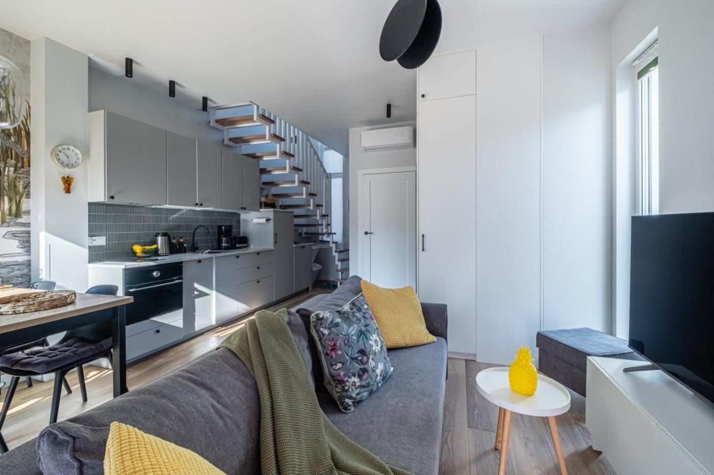 Dom wakacyjny. This holiday home consists of 1 living room, 2 separate bedrooms and 2 bathrooms with a walk-in shower and a hairdryer. Guests will find a stovetop, a refrigerator, a dishwasher and an oven in the kitchen. The holiday home also offers a barbecue. This holiday home features a coffee machine, a seating area, a flat-screen TV and a terrace. The unit offers 4 beds. Dom wakacyjny - 6 osobowy. Powierzchnia pokoju ok.: 54 mkw.
